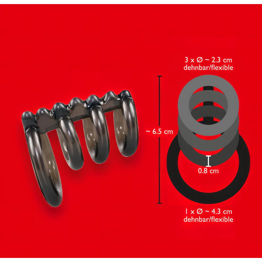 Rugalmas, kellemes tapintású anyagból készült, négy péniszgyűrű, vastag fallal, melynek köszönhetően segíthet megtartani az erekciót.