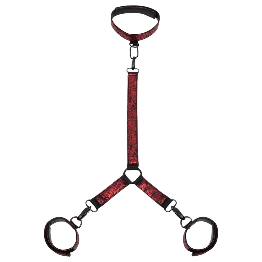 Szexi, vörös szatén borítású bilincsek, amit a hozzá köthető nyakörvhöz csatolhatsz.
