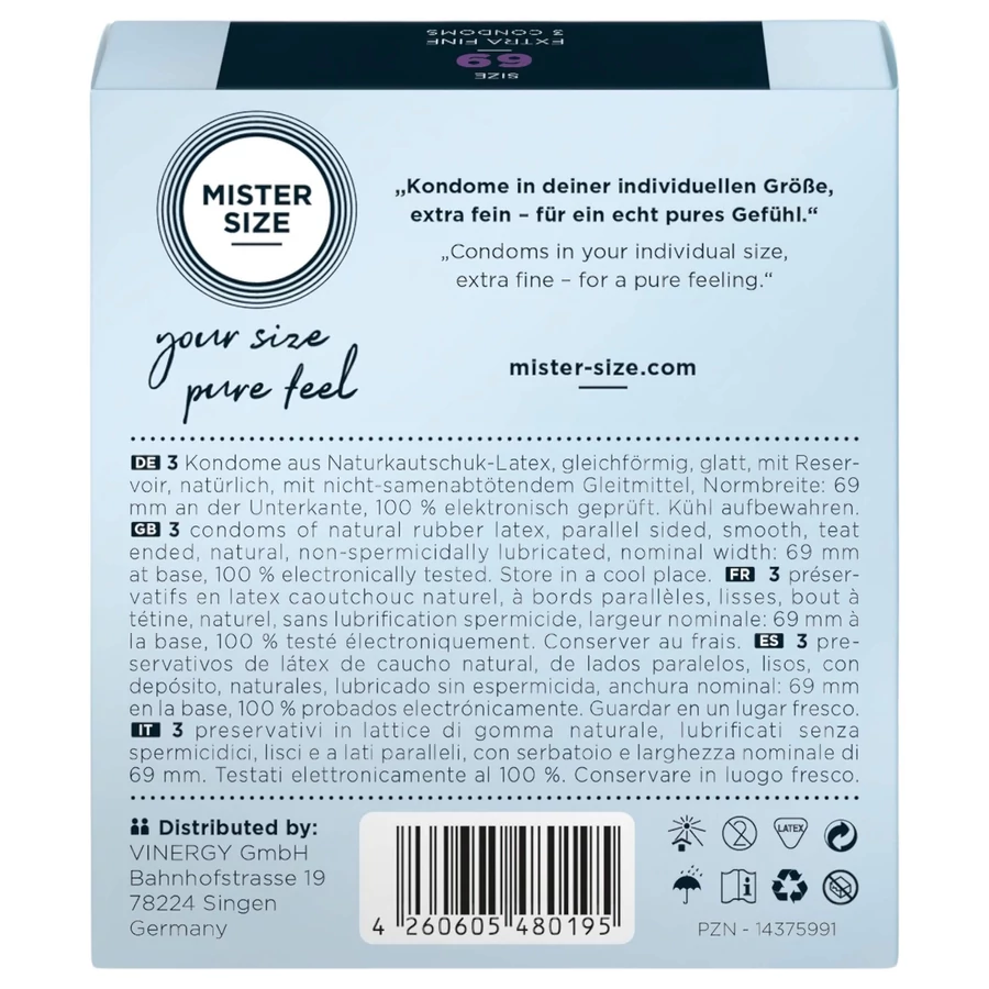 - 3 darab Mister Size 69 mm-es, ultravékony, síkosított óvszer, külön-külön csomagolva.