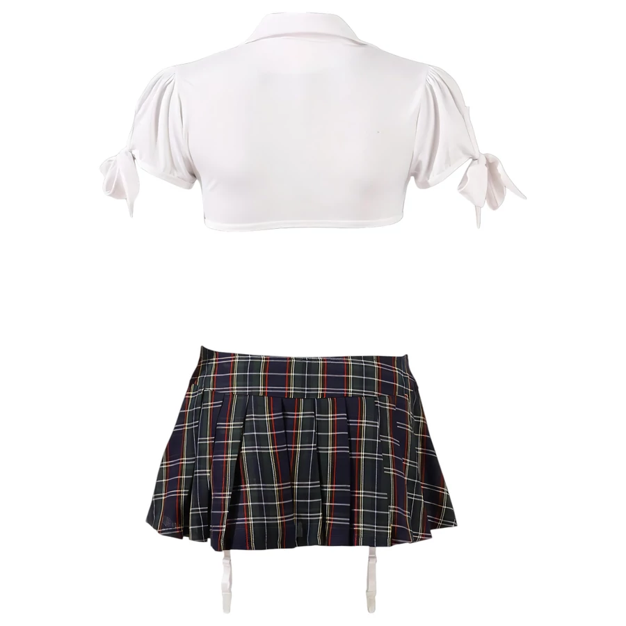 - Részletgazdag kialakítás: A kockás nyakkendő és a harisnyatartós alsó fokozza a szett autentikus megjelenését.
