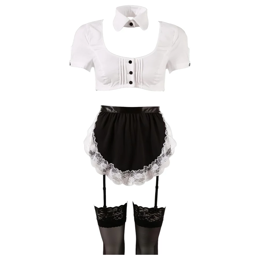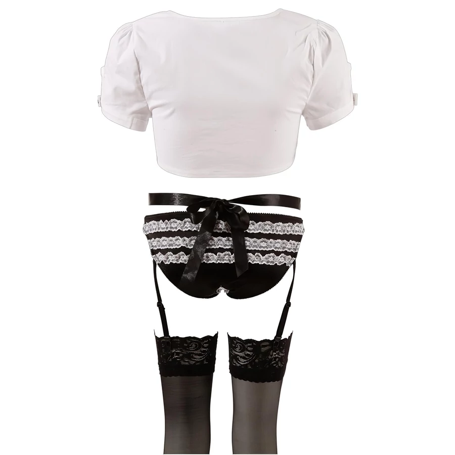 - Fekete csipkés harisnya, fehér gombos gallér, főkötő hajpánttal és kötény fehér csipkeszegéllyel, fekete szatén derékpánttal – teljes megjelenést biztosít a szerepjátékhoz.
