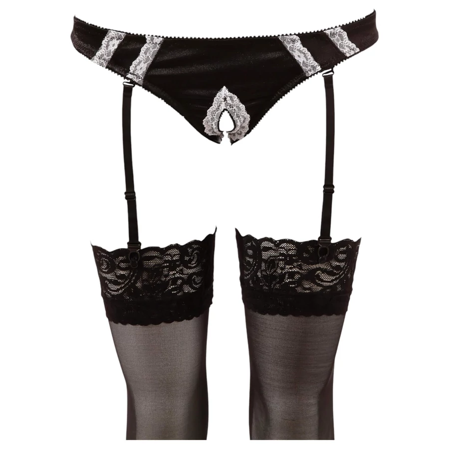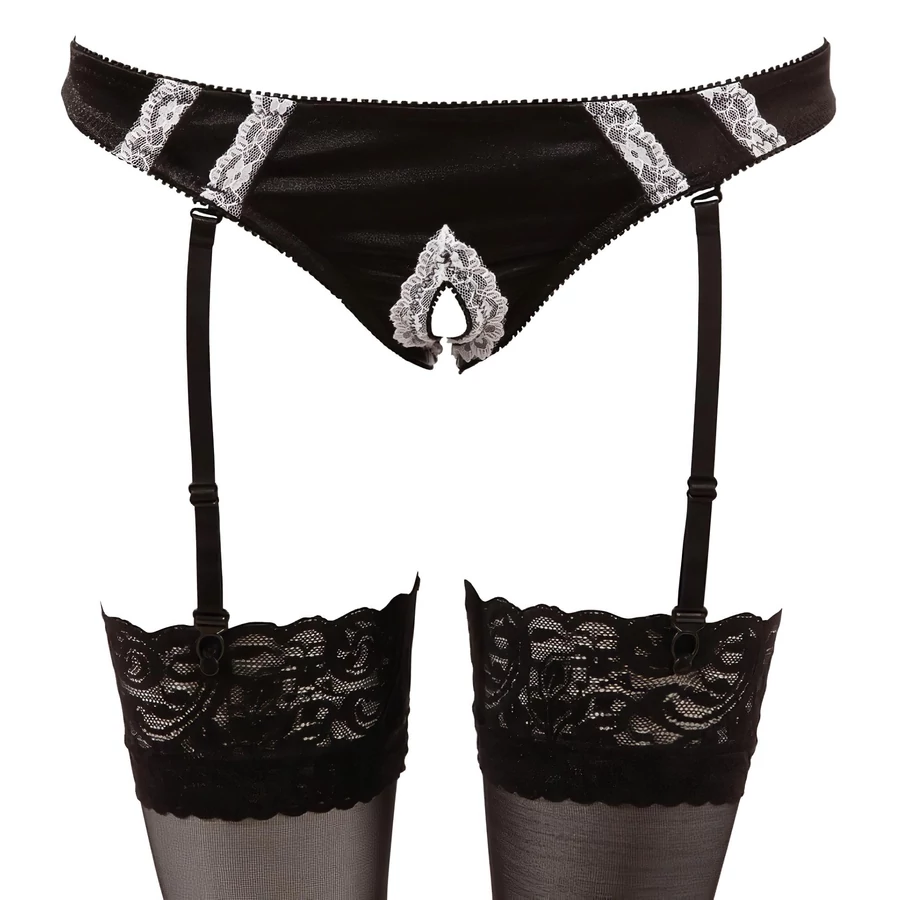 - 1 darab fekete szatén harisnyatartós alsó fodros, fehér csipkedíszítéssel, szeméremnél nyitott kialakítással