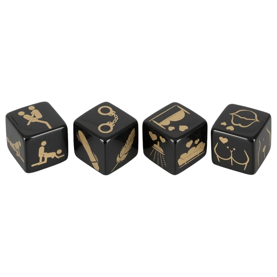 • 4 db erotikus dobókocka, különböző témákkal (pl. testrészek, helyszínek, pozíciók, eszközök)