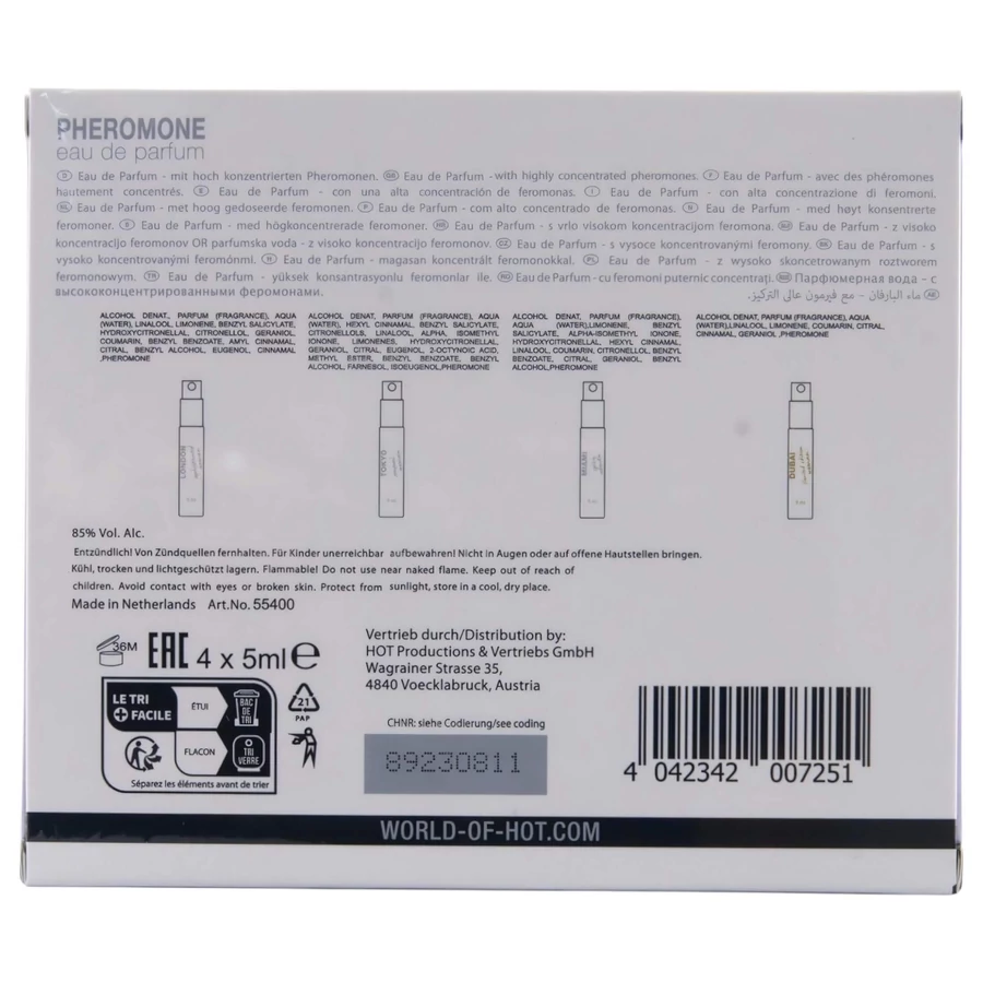 Exkluzív pheromon parfüm szett, amely négy különleges, városi ihletésű illatot tartalmaz.